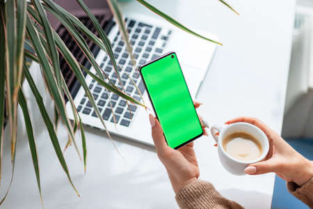 Young woman's hands scrolling and checking her phone and drinking coffee. Focus on the mobile phonechromakey, green screen on screen.