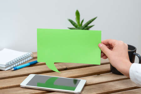 Woman Holding Speech Bubble With Important Message On Table With Phone, Pen And Notebook. Dialogue Balloon With Crutial Information On Desk With Cellphone And Plant.