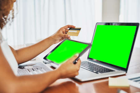 Woman holding a credit card and using cell phone for online shopping.