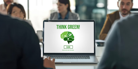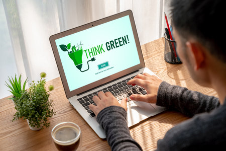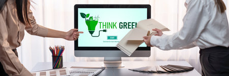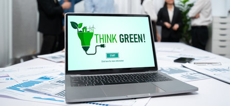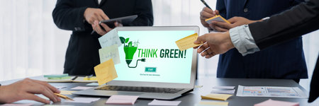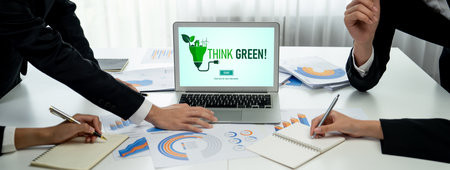 Diverse group of business people planning business marketing with environmental responsibility for greener ecology. Productive teamwork contribute natural preservation and sustainable future. Quaint