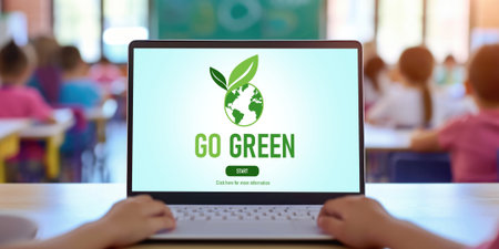 Flat lay photo of green adhesive note on laptop with ECO life text. Save the planet. Energy efficiency concept.