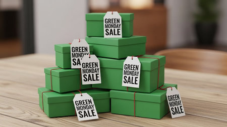 Green gift boxes with sale tags on a wooden table. 3d rendering