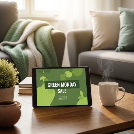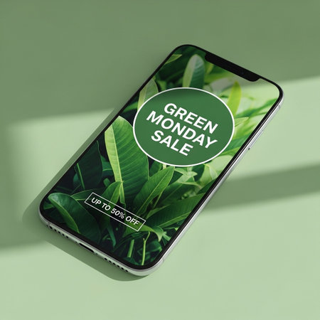 Green shopping bags with Cyber Monday text hanging on clothes hangers.
