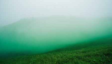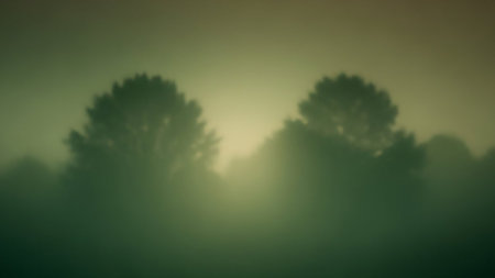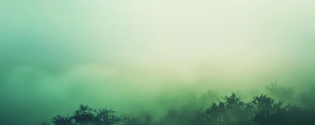 Silhouetted trees emerge from a thick, atmospheric fog with a soft green and golden hue, obscuring the landscape in a tranquil, hazy scene.