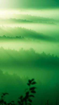 Green showing misty green forest landscape with sunbeams breaking through the fog creating ethereal light rays illuminating the undulating terrain and silhouetted...