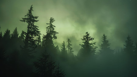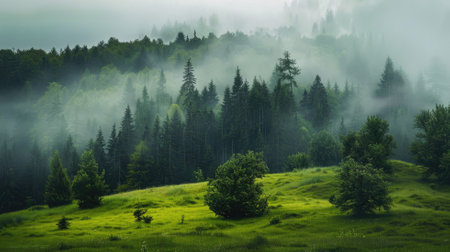An atmospheric landscape features tall evergreen trees shrouded in thick fog. The scene is dominated by shades of green and gray, with soft lighting and a blurred background. Suitable for a variety of uses including environmental, travel, and natural beauty themes.