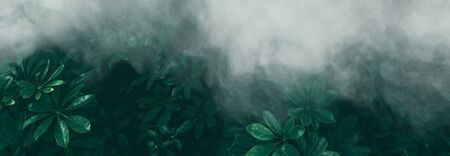 Vertical garden with tropical green leaf with fog and rain, Dark tone