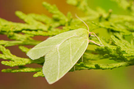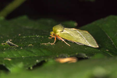 Green oak tortrix, tortrix viridana moth animal sitting on grass stem. Macro animals