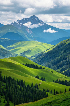 Mountain landscape with cloudy sky, natural outdoor travel background