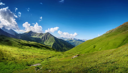 Green hills under blue cloudy sky. Mountain valley for pasture