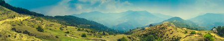 Evening light and spring greenery of hills and mountain slopes, panoramic view
