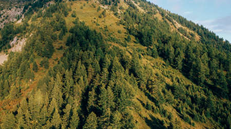 Pine forest on background of mountain peaks. Tourism in mountain valley