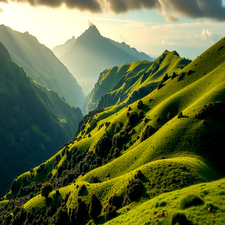 Beautiful sunny view to green hills and mountain in sunlight. Scenic nature landscape with lens flare on background of green hills with trees. Colorful alpine scenery to green mountains in sunlight.