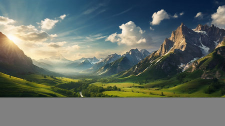 Panoramic view of the Swiss Alps and meadows. Switzerland