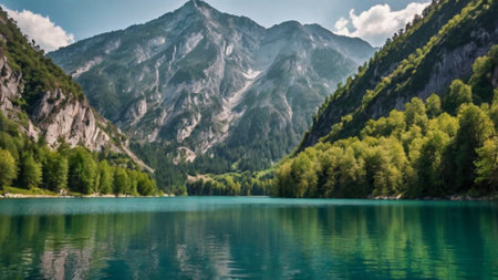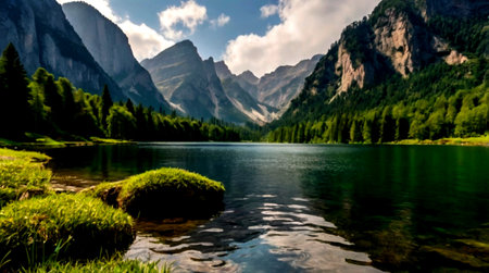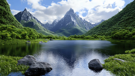 A serene mountain landscape with calm lake reflecting towering peaks and lush greenery under partly cloudy sky. scene evokes tranquility and natural beauty