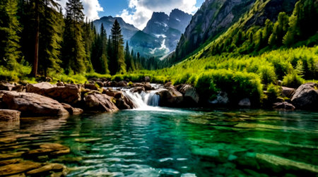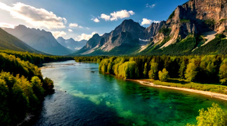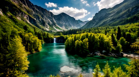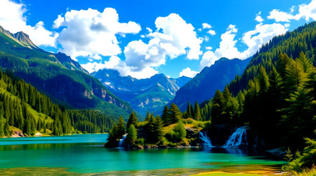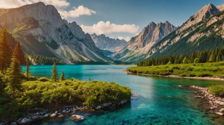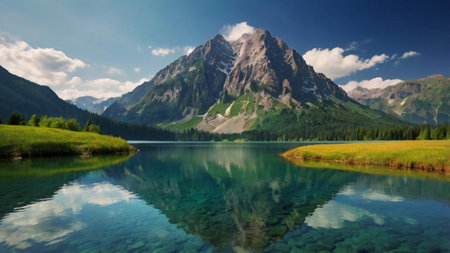 Breathtaking mountain landscape featuring a serene lake reflecting the stunning peaks and lush greenery. Ideal for nature and travel themes.