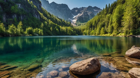 Beautiful mountain lake with crystal clear water and high mountains in background