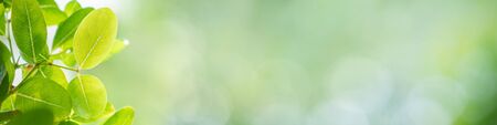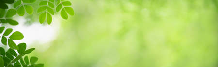 Panoramic view of beautiful leaf in sunny day. Green nature background with copy space for banner and cover page.