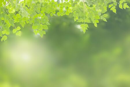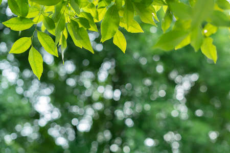 Natural green leaves on bokeh and sun light with copy space. Beautiful green nature background. Safe world and ecology concept.