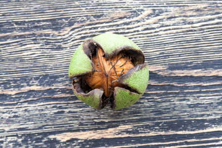 Walnut fruit on the table. Raw walnuts in cracked green shells on a wooden table.