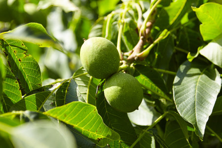 Unripe green walnut on a tree branch. Waiting for a good harvest of nuts.
