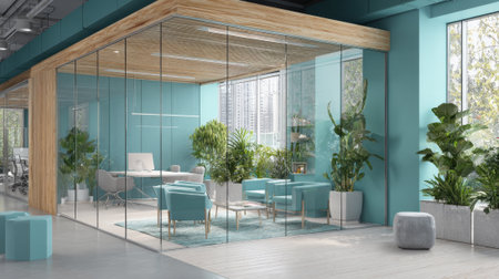This setting features a contemporary office space surrounded by glass walls. It showcases teal furniture abundant greenery and large windows that invite natural light.