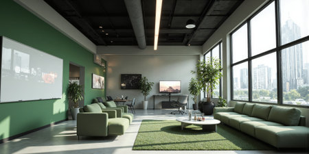 Modern Green Office Interior Design with Futuristic Technology, generative Ai