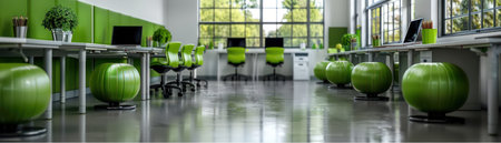 Green, sustainable and environmental office space with daily employee rush. Modern and nature friendly startup business with ESG standards and care for worker wellness and healthy environment