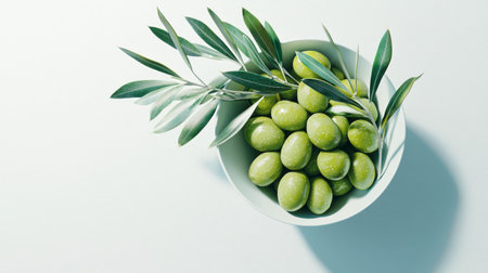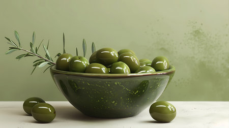 Fresh green olives in a bowl with olive branches - perfect for culinary and kitchen decor