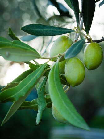 Olives on a branch of an olive tree. Detail close-up of green fruit olives with selective focus and shallow depth of field.