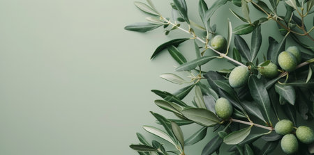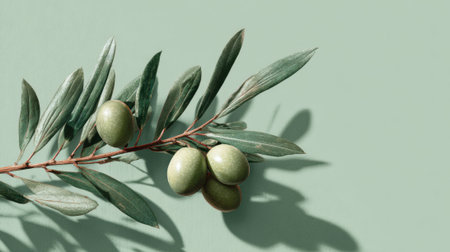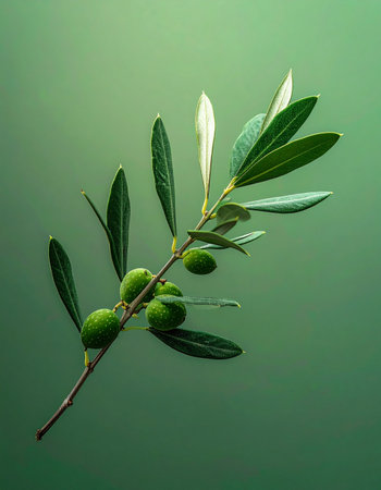A single, delicate olive branch, adorned with young green olives, is captured against a serene, monochromatic green backdrop. This minimalist composition evokes a sense of natural purity, growth, and the simple elegance of Mediterranean flora, perfect for themes of wellness, organic beauty, and clean living.