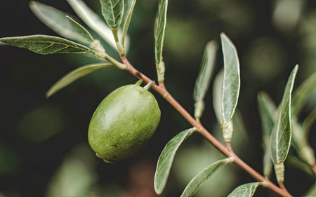 Green olive on branch in organic orchard, homegrown produce plantation, selective focus