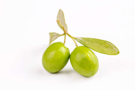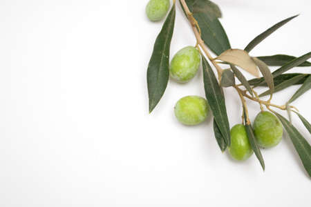 Fresh green olives on a branch on a white