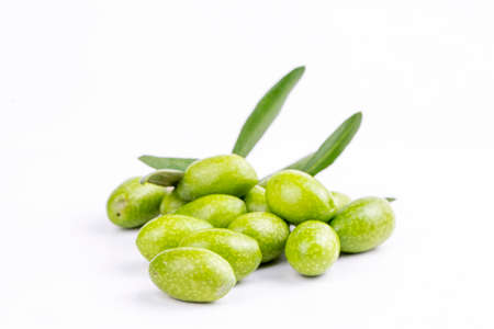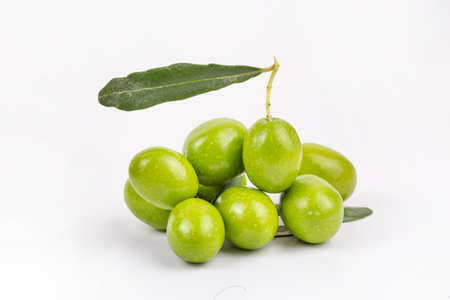 Green olives on a white background. Fresh olives with leaves.