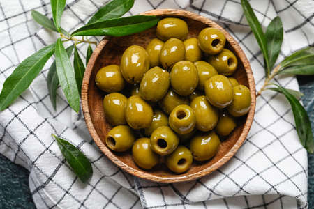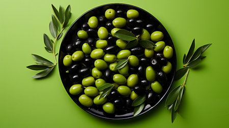 AI Generated. top view green olives with leaves on dark green background