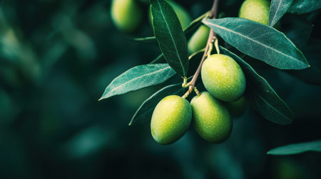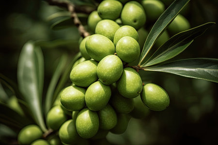 Lush green olives hang elegantly from branches, surrounded by vibrant leaves, capturing the essence of natural beauty and healthy growth in this tranquil outdoor setting.