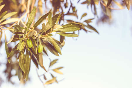 Closeup of a olive branch with leaves and green olives. Olive tree close up in Greece, Corfu, clear sky background.