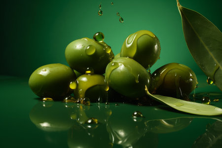 Olives and olive oil floating on green background, AI generated