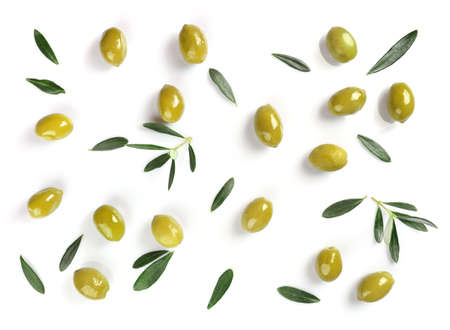 Green olives isolated on white background. Fresh olives with leaves.
