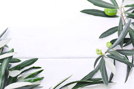 Fresh olive branch with berries on a white wooden background. Traditional plant of Italy. Free space for text. Flat lay