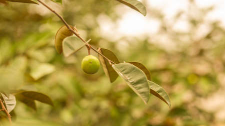 some green olives hanging on a tree branch with leaves in the photo is blurred and blured by the light