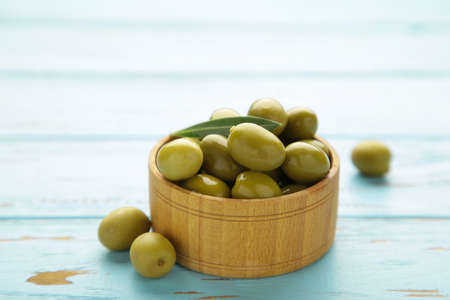 Composition with tasty green olives on light wooden background