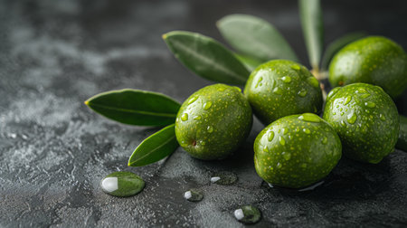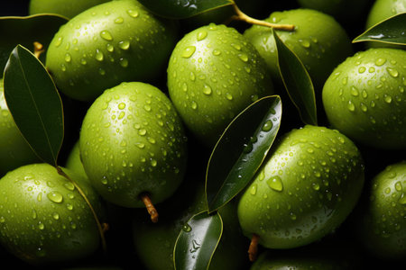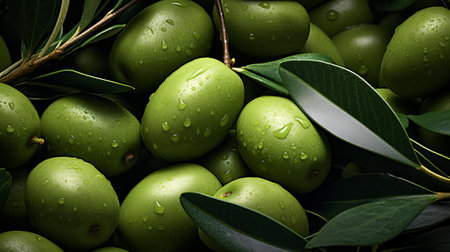 Green olives with leaves and drops of dew, closeup