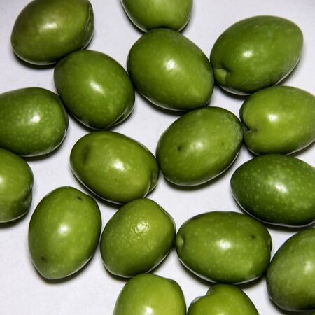 Green olives ready to eat in white background.