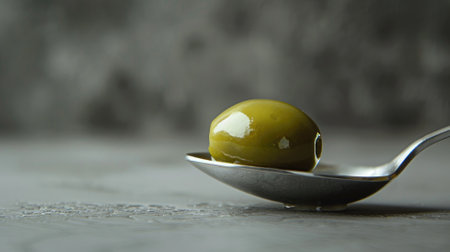 Single green olive rests on spoon against blurred gray background