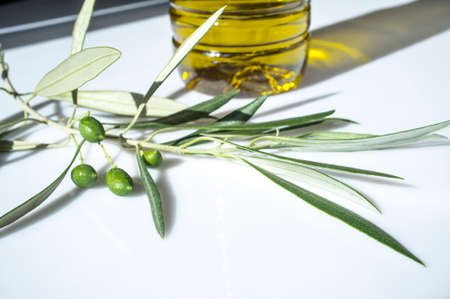 Olive oil bottled with young olives branch. isolated over white