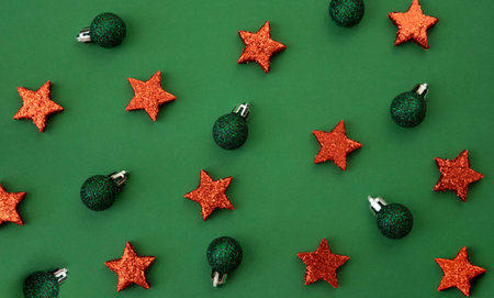 Festive background with red and green Christmas tree toys on a green background.