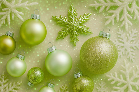 Green christmas baubles and snowflakes on green background