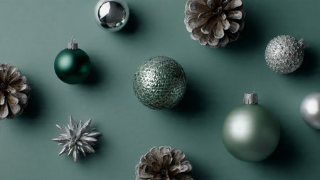Modern green-and-silver holiday composition with balanced negative space for product placement.