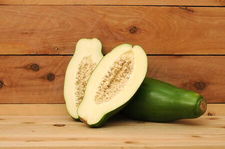 cutting and whole green papaya on wooden shelf
